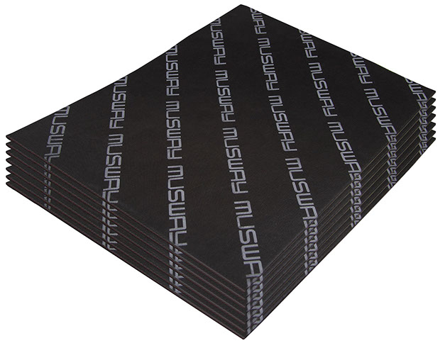 The waterproof special high-end damping material MW-FM 5.5 from Musway consists of a 5.5 mm thick sandwich composite made of 3 high-quality, thick materials plus additional fabric fleece. The first, 1.2 mm thick butyl layer ensures optimal adhesion and stabilization of sheet metal parts. The second layer of 2.8 mm thick special rubber eliminates residual noise in other frequency ranges. The third layer is again made of 1.5 mm thick butyl, which offers additional cushioning. The fourth layer is a special non-woven fabric, which provides additional damping and also serves as a top layer for e.g. door panels. The layer also further reduces direct touch noise. The set consists of a total of 7 mats, each measuring 500 mm x 700 mm (2,45 m2), which can be easily attached to the interior of the car. Noise reductions of up to -32dB are possible.